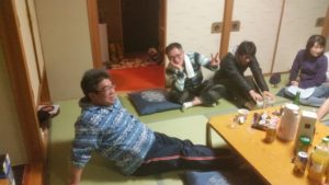 たっぷり滑った夜は、入念にストレッチ。でも膝が曲がってます。