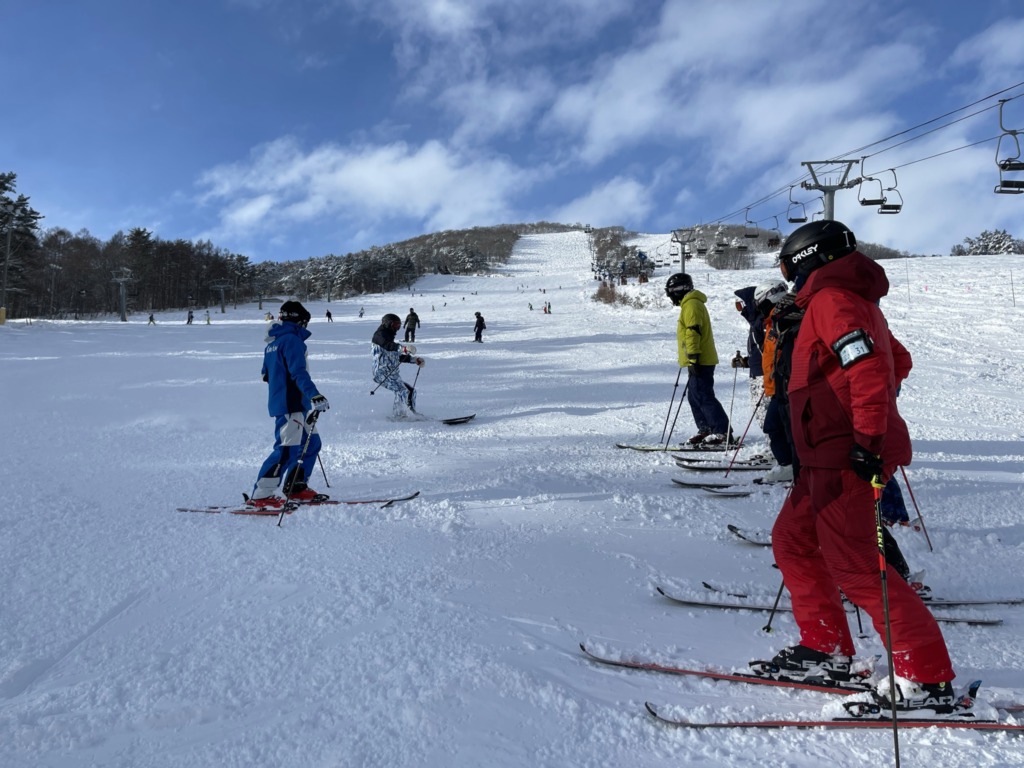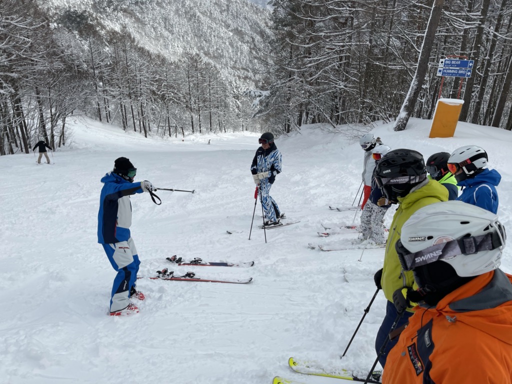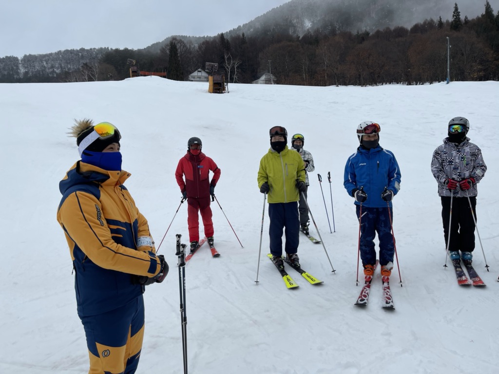 2日目は、記念撮影後、北志賀スキースクールより講師を派遣していただいて、実践的な講習をしていただきました。