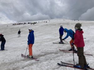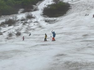 今年は雪が少なく、スキーを運んでくれるサービスがなかったので、かついでリフト乗場まで行きます。